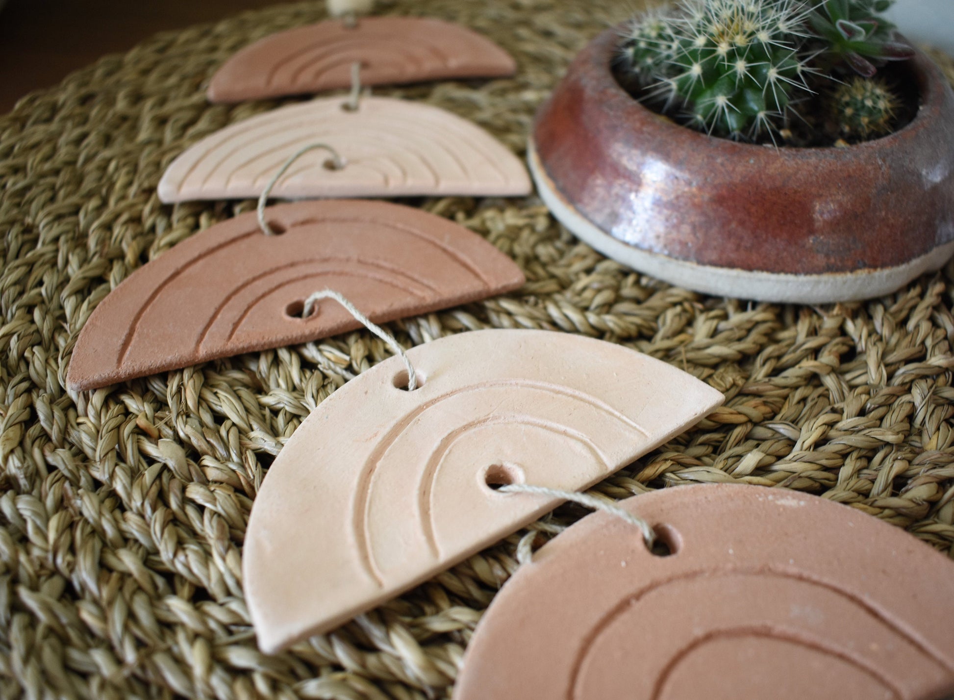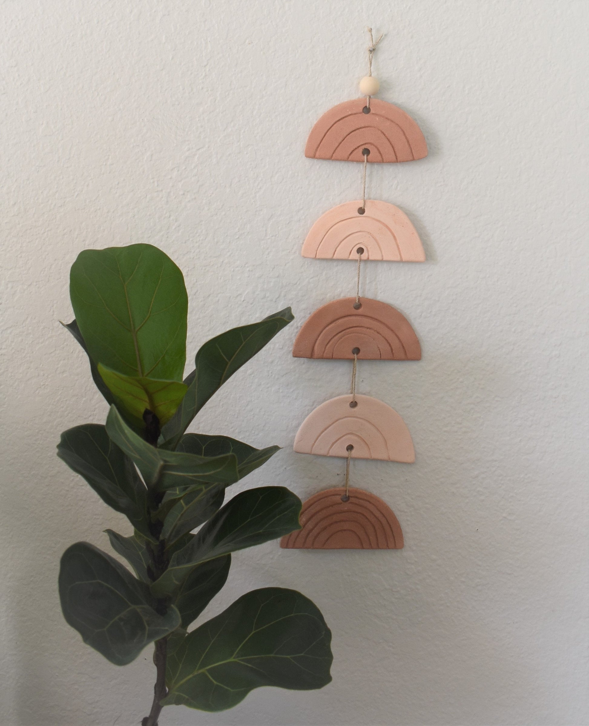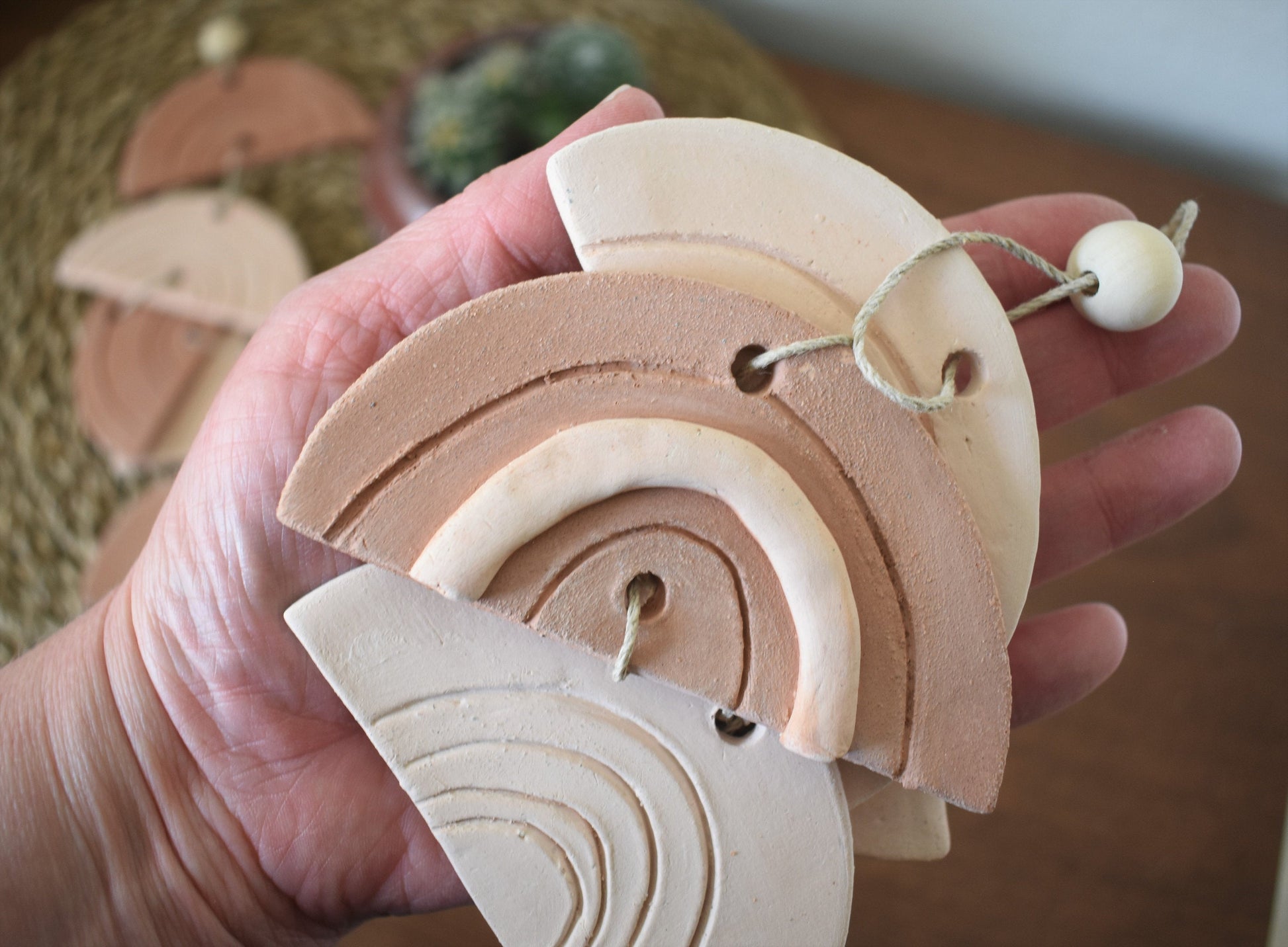 MATERIALS & MEASUREMENTS Each ceramic rainbow element starts out as soft clay, then each is cut by hand from a slab. After they are rounded and shaped, detailing is added by hand to make each rainbow completely unique. After drying, the pieces are bisque fired in a kiln. The piece is then assembled and finished with natural cotton cord and raw wood bead. LONG: 7 rainbow pieces, approx. 22 inches SHORT: 5 rainbow pieces, approx. 15 inches Made of stoneware, this wall hanging is sturdy and weather-resistant. It can even be hung outside to compliment patio décor. __________________________________