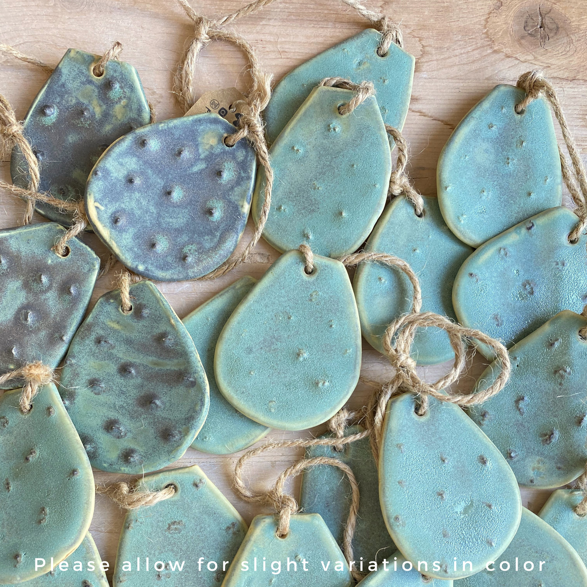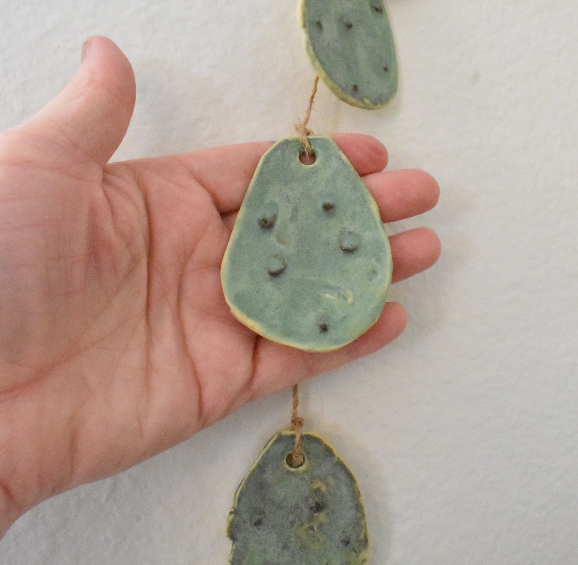 Each prickly pear pad starts out as soft clay, then each pad is cut by hand from a slab. After they are rounded and shaped, teeny prickles are added to the surface to mimic the natural form of the opuntia.