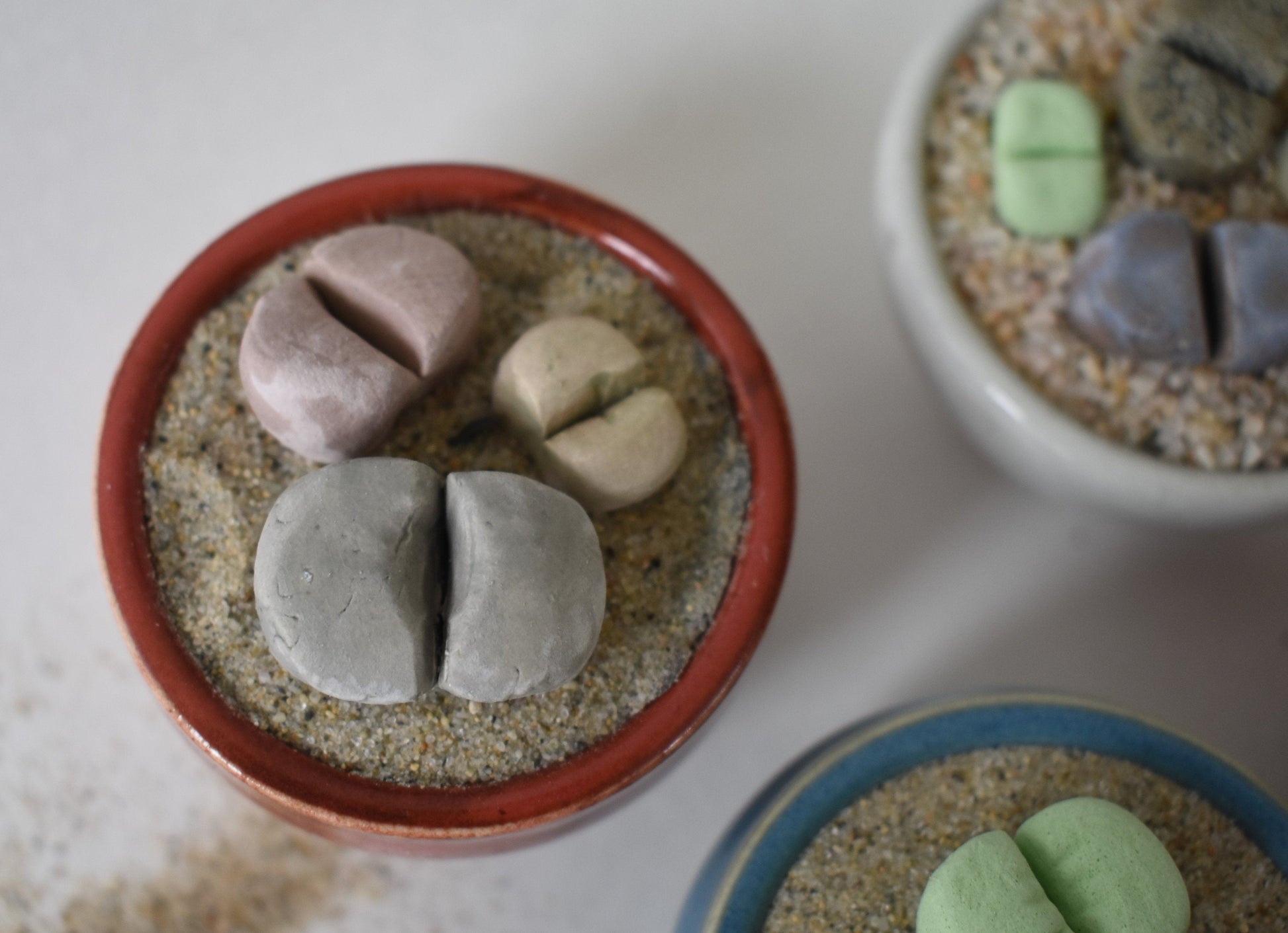 Everyone's favorite strange succulents, now forever in ceramic stoneware. Lithops are known as "living stones" and in nature look like small rocks peeking out of the sand in pairs. If you've ever had a real one, you know that they are notoriously hard to care for, and this adorable phase is rather fleeting. I have captured the odd, alien-like beauty of these creatures with clay so now they are yours to enjoy forever. Each lithops arrangement is unique with its own personality of muted tones and textures just like lithops in nature. But these need no light, no water, no care whatsoever! No gardening skills required.