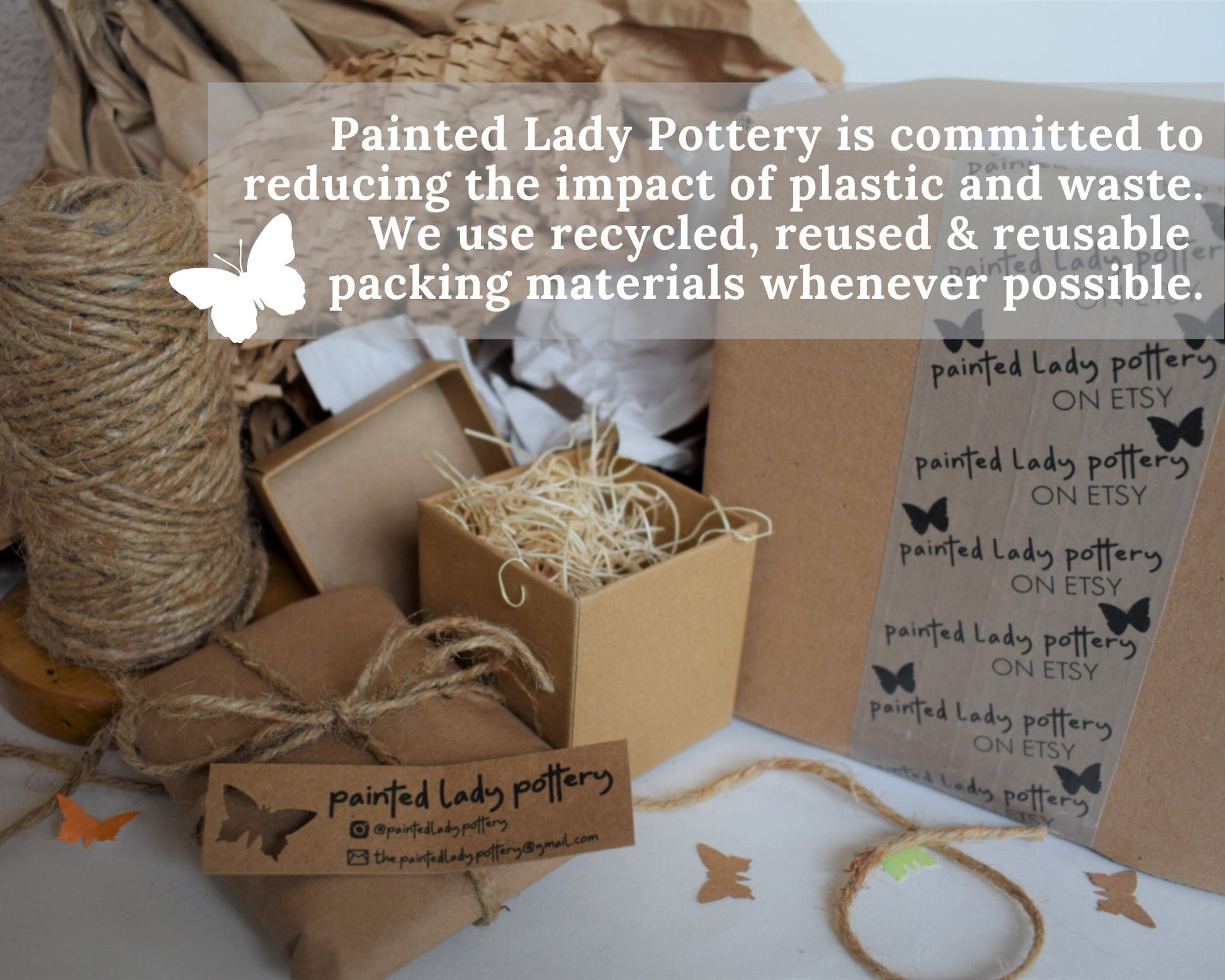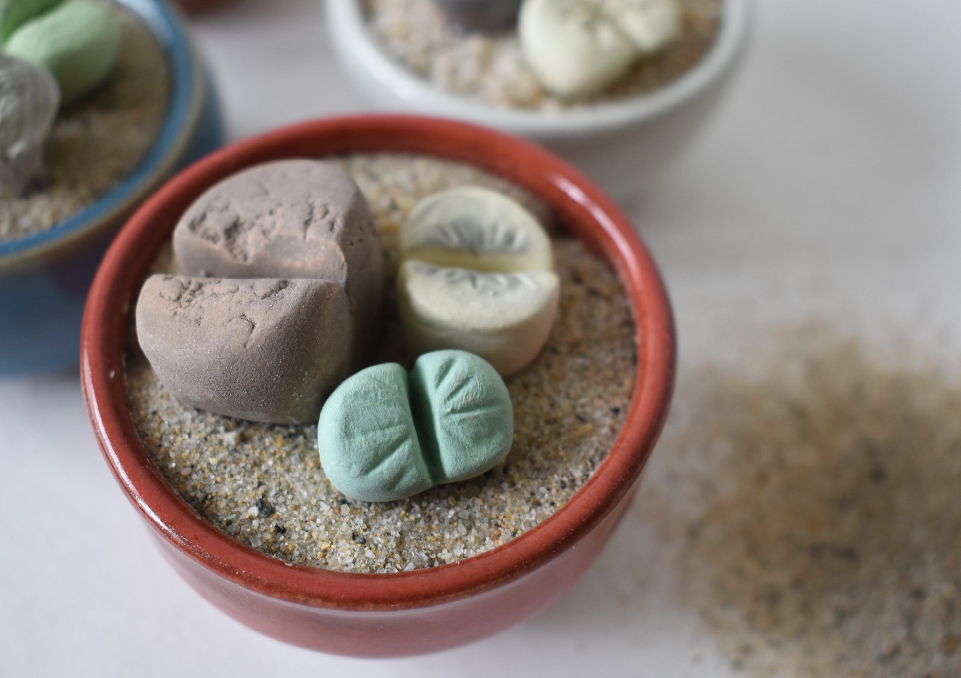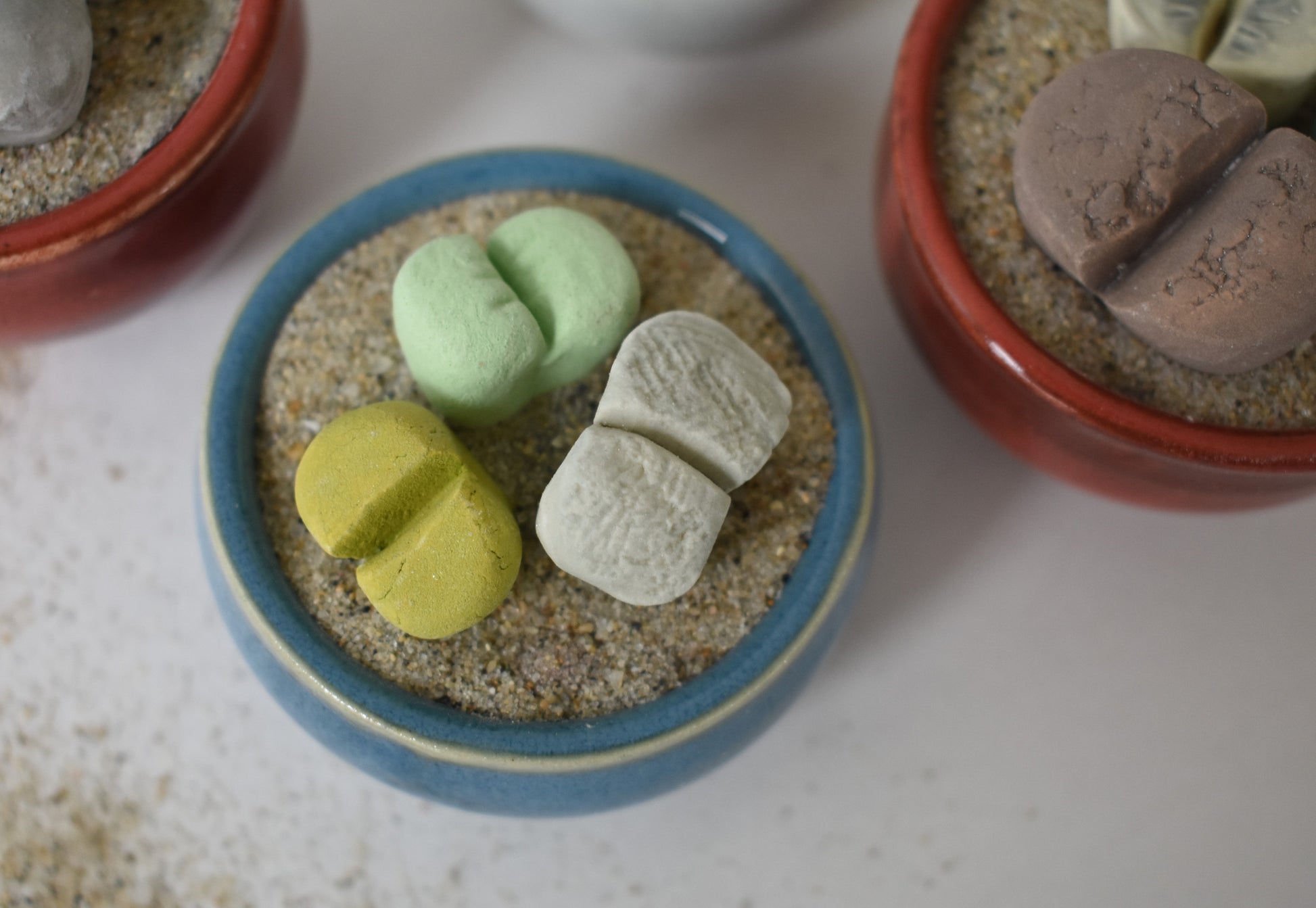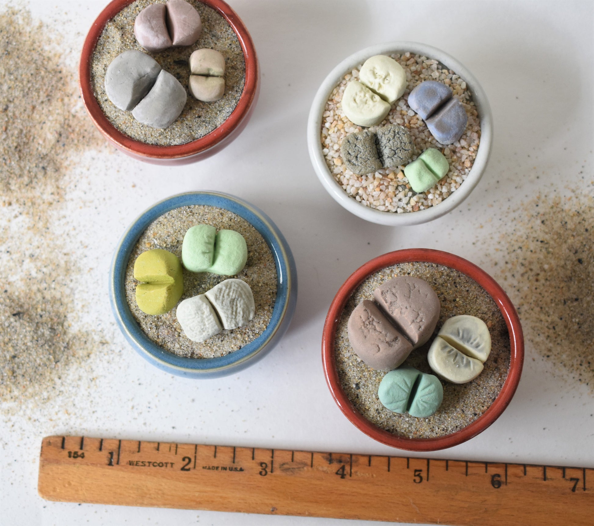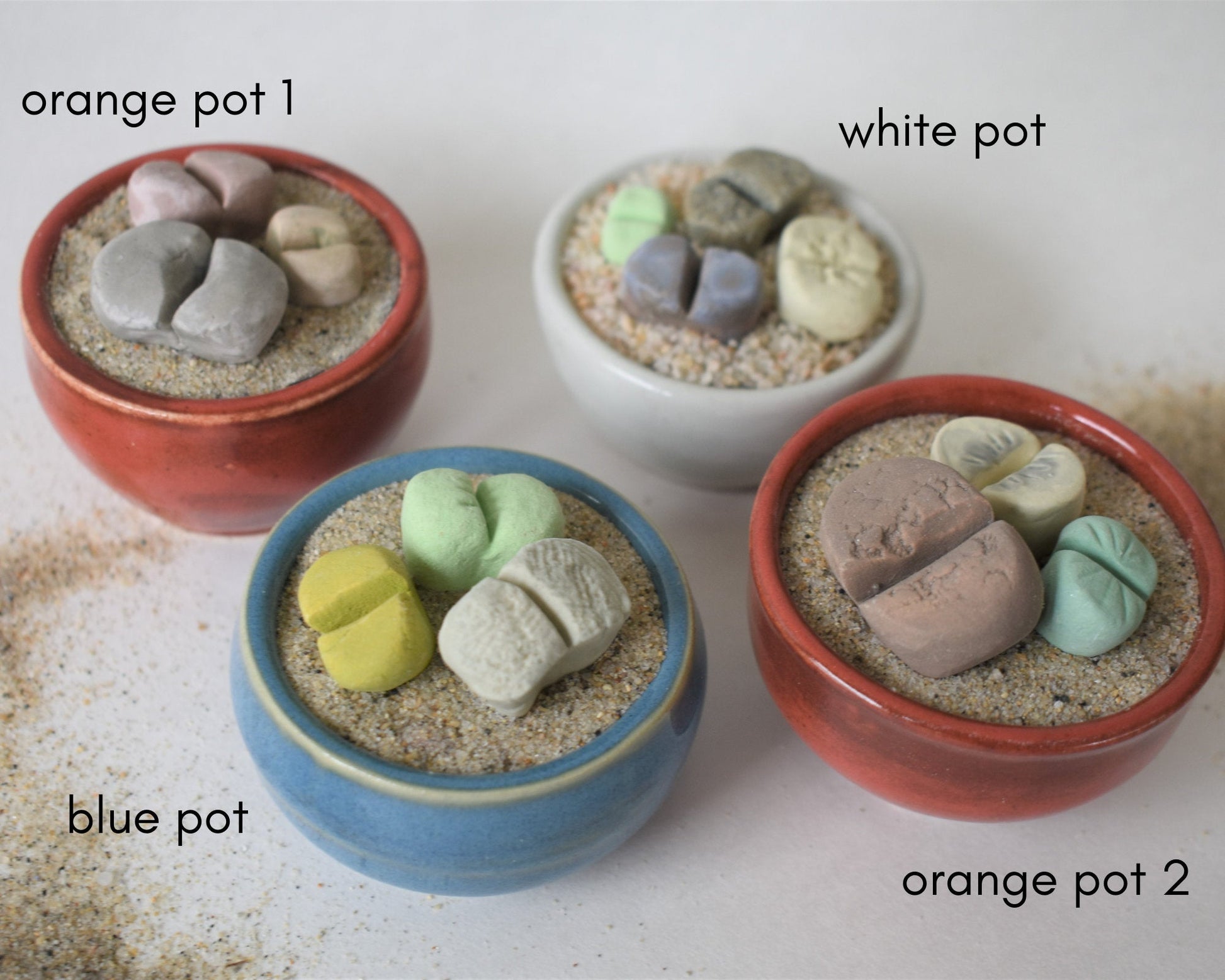 INCLUDED: ceramic lithops arranged in a hand-thrown mini-pot, wrapped tightly for shipment with a small bag of extra sand.