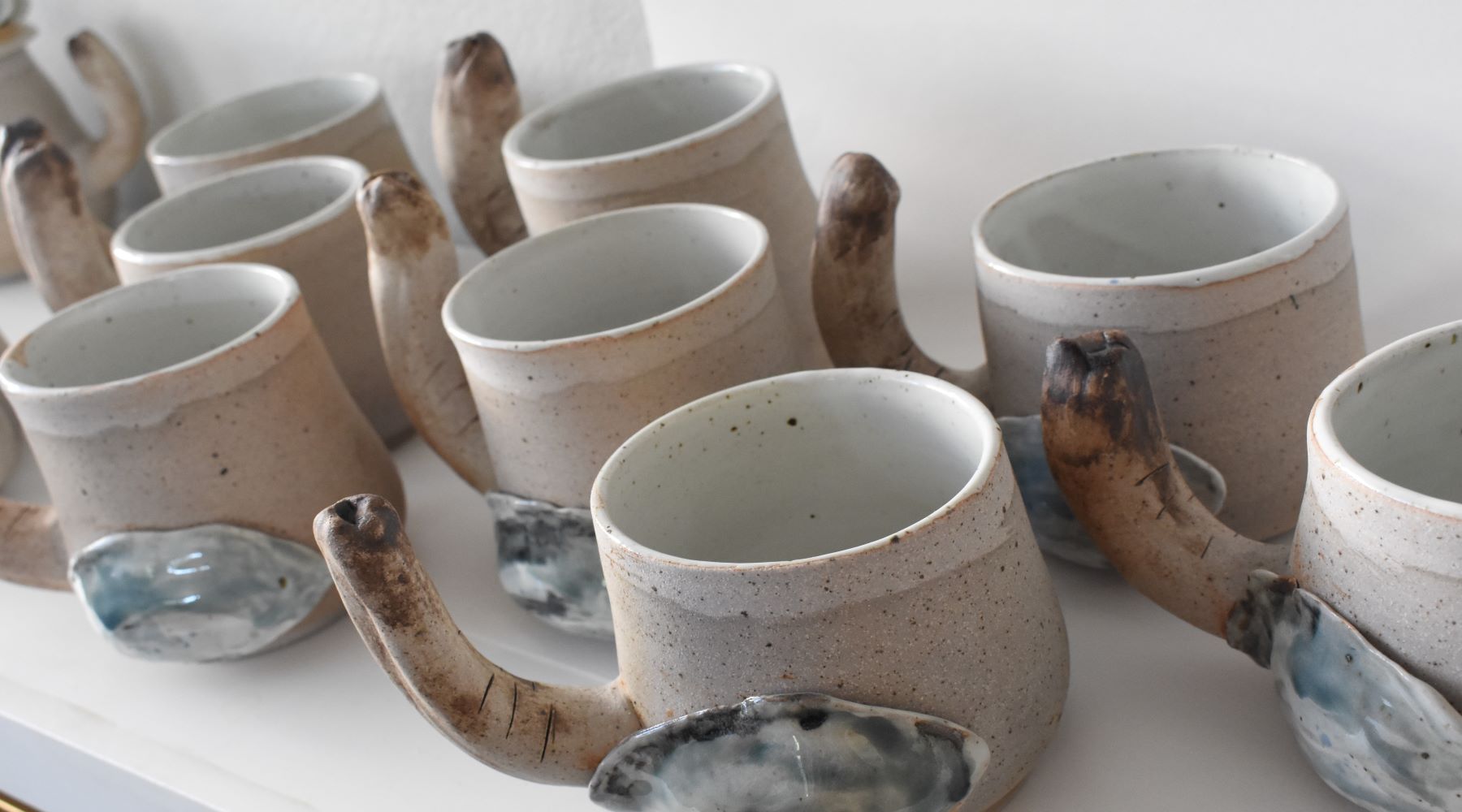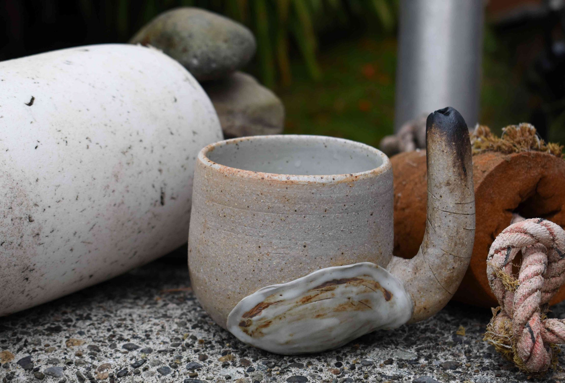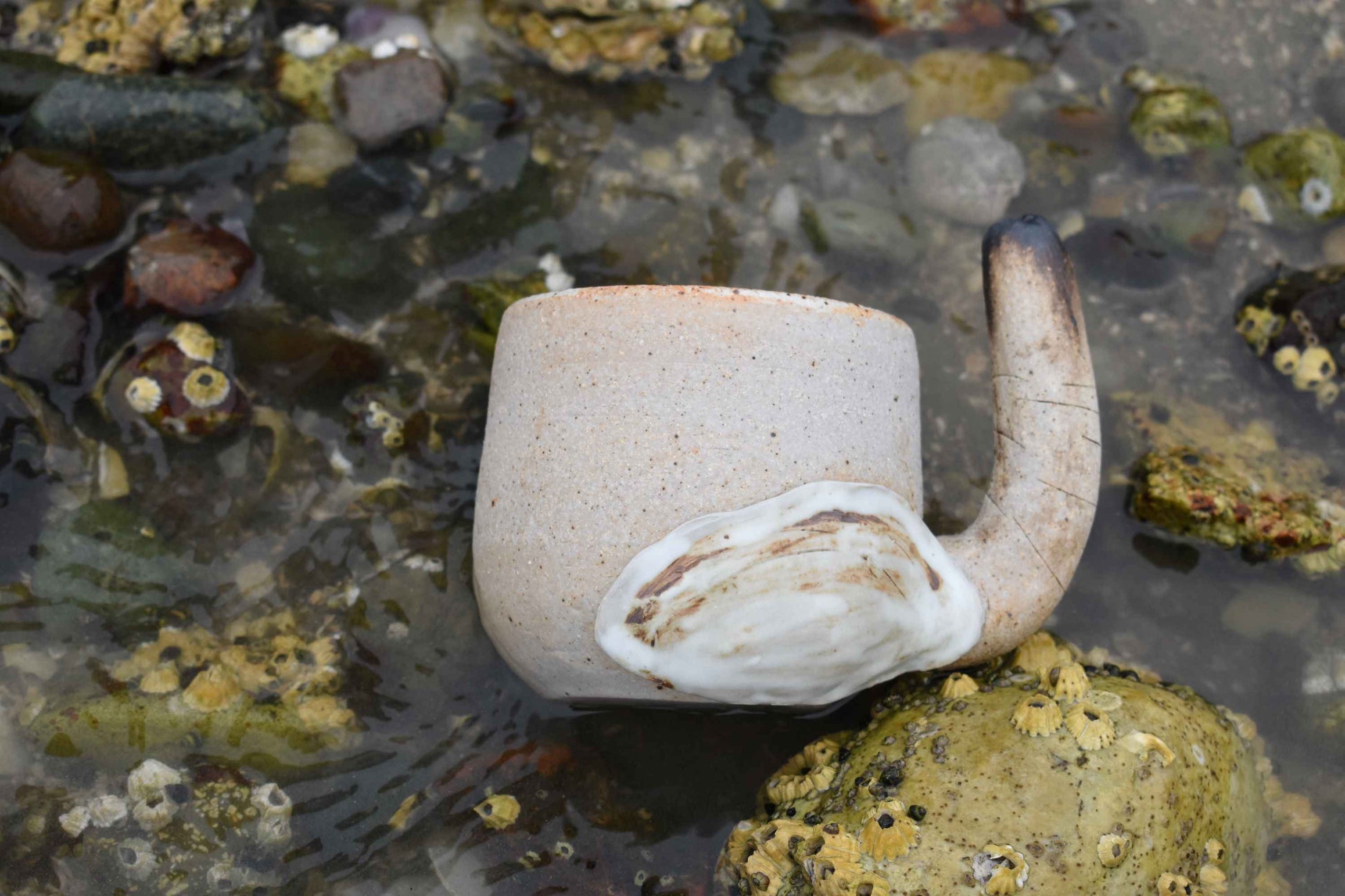 ~Each of these handmade, ceramic mugs started as a soft lump of clay. They were thrown on a potter's wheel, and a shell is added molded from an actual shell. The hand-pulled handle is attached and the mug is then kiln-fired. Glaze is applied and the pieces are kiln-fired again, reaching up to 2300° F.