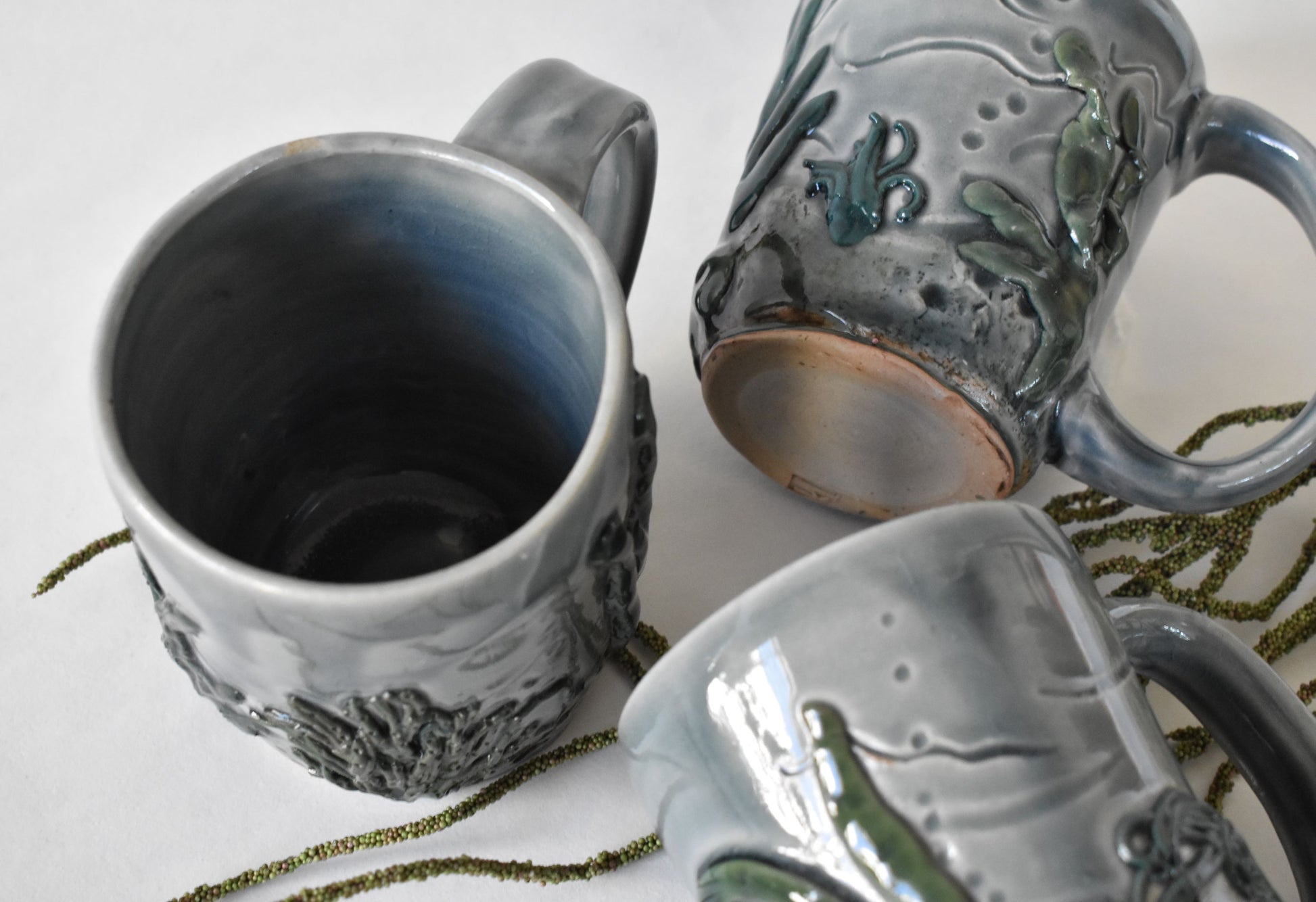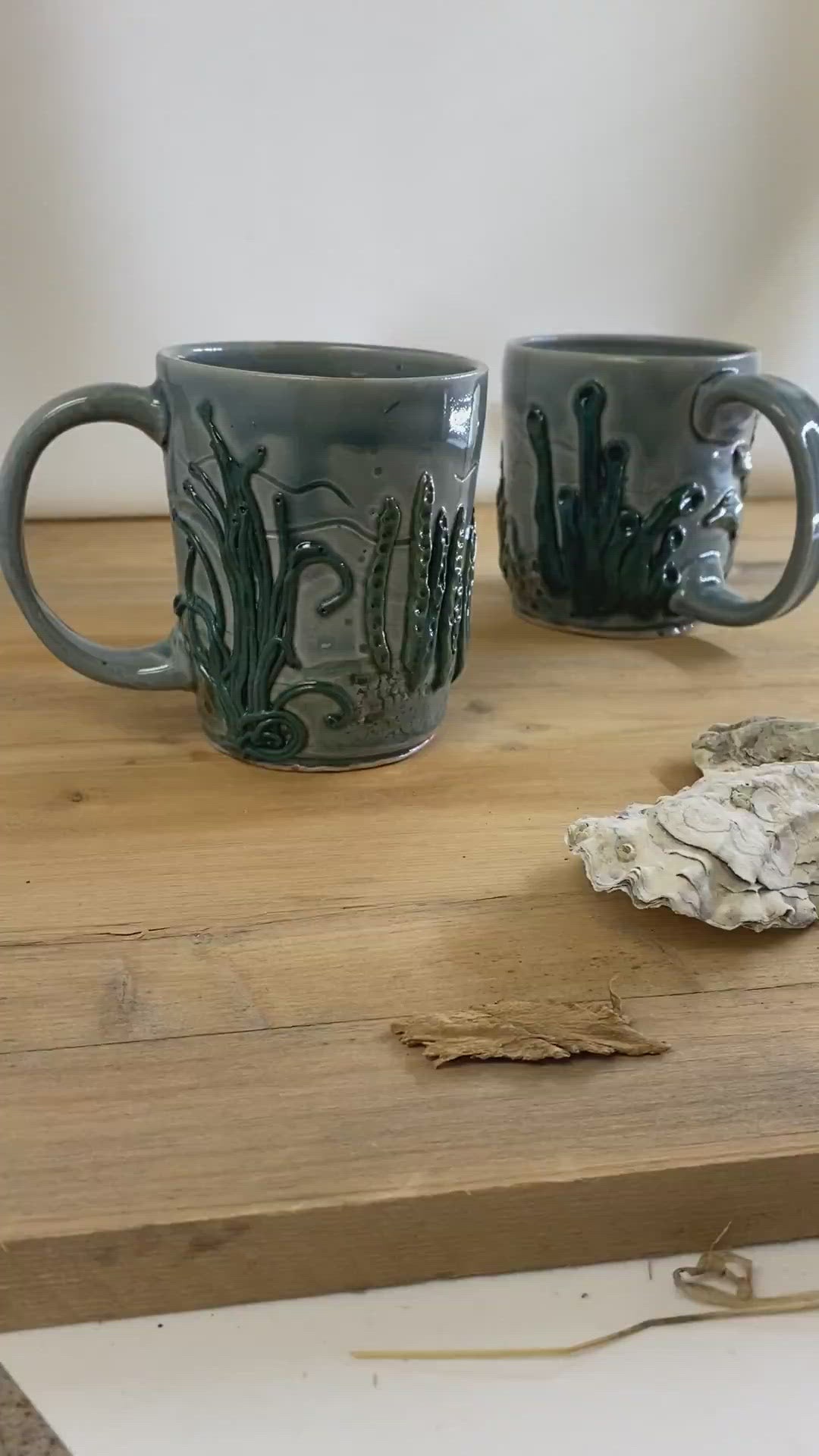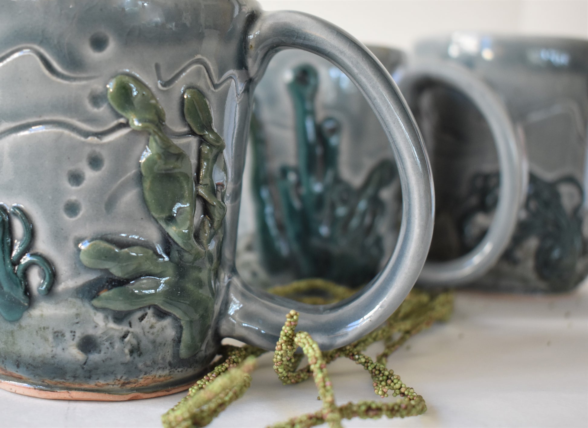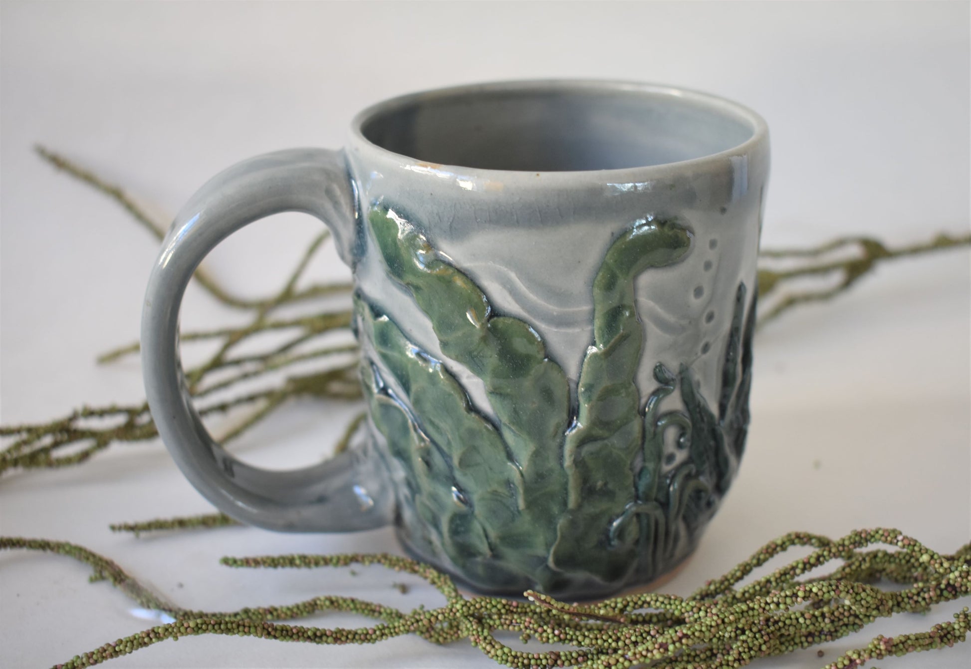 Delicate tendrils of green seaweed swaying in the underwater current of the smooth, grey-blue seawater. Each mug is unique, no two are alike!